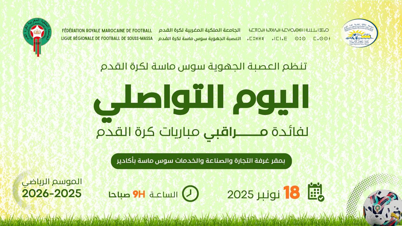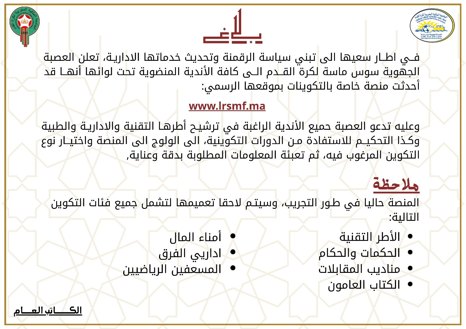 تنهي ادارة العصبة الجهوية سوس ماسة لكرة القدم الى علم السيدات والسادة مسؤولي اندية القسم الممتاز والشرفي الاول والثاني ان بطولة اقل من 14 و13 سنة (كرة القدم 11) ستنطلق بداية من العطلة المدرسية المقبلة لذى على الاندية الراغبة في المشاركة في هذين المنافستين معا وضع طلب المشاركة بادارة العصبة قبل يوم الجمعة 17 اكتوبر 2025